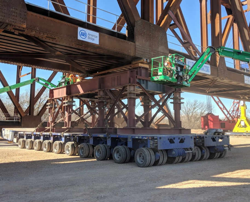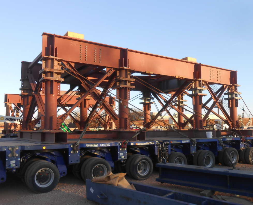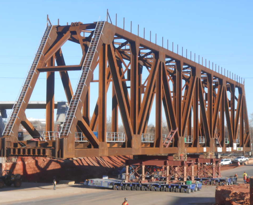 This bridge was an active railroad bridge over a congested freeway. The bridge was assembled close by and transported overnight into location to minimize disruptions to rail and road traffic. Our scope was to fabricate pedestal framing between the dollies and the bridge. The project was completed on time with no field assembly problems.