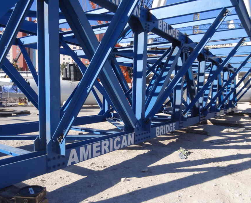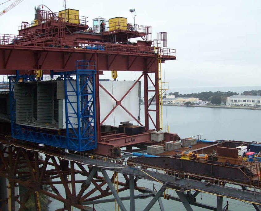 Shortly after completion of the tower and truss detailing, we detailed the cross beam and tower erection gantry crane. This was a challenging project because this crane had two designed purposes. First it was to serve as a gantry style crane to span the two sides of the bridge and install the cross beams that connect the two sides. After, cross beam installation, the crane was to be re-purposed to be the main tower erection crane. To facilitate this the gantry legs were removed, the main beams shortened, the walkways relocated and the crane was placed on top of the T1 erection tower. Since the two different cranes were designed by different engineering firms, we needed to coordinate the two designs into one combined work package of drawings that would work for both designs. In the end, both designs worked flawlessly and it was a successful project!