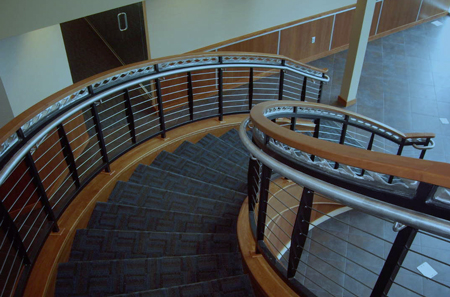 The owner asked Finnoe Design to design and detail a feature stair for their main entry. They wanted a grand stair and the stair the architect had designed did not fit in the space. The customer was very pleased with the stair, especially the decorative inlays with the company’s custom swoosh logo.