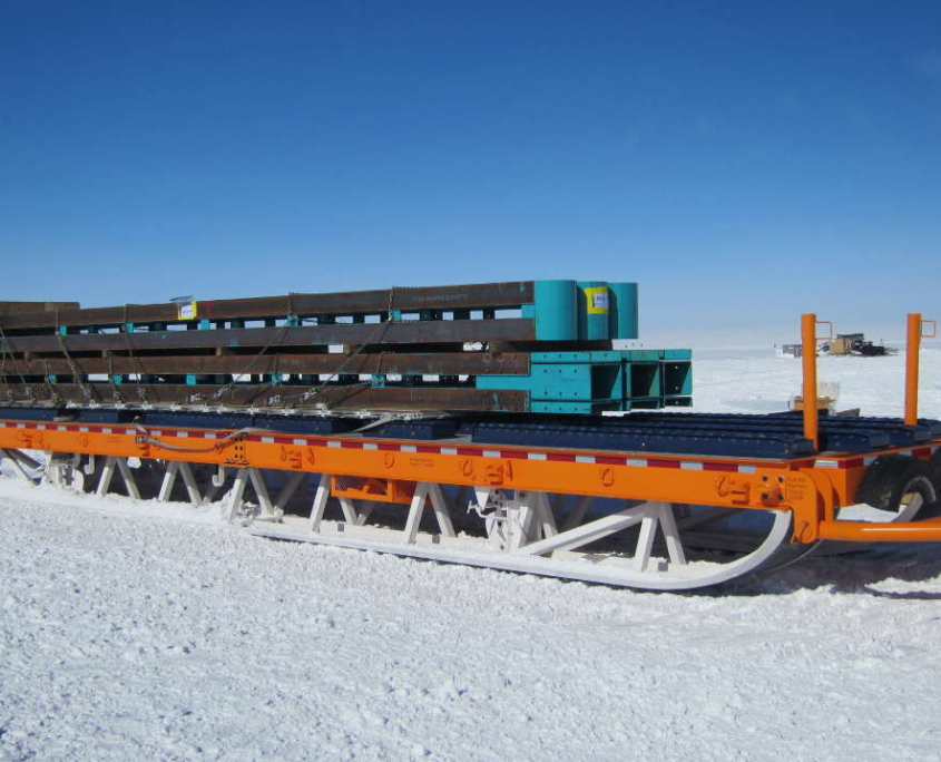 Custom designed equipment hauling sled with UHMW plastic skinned skis designed for rough duty in a cold weather environment. The sled was designed to operate in conjunction with the Cargo Offload Sled.