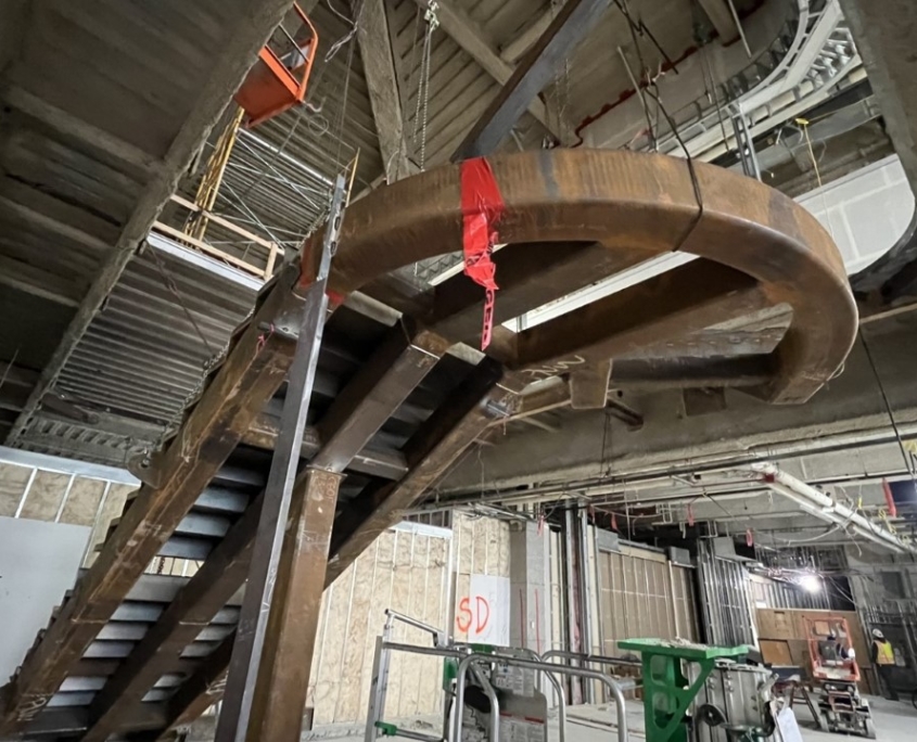 The hub and axle at the center of the wheel was too heavy to lift with a conventional crane so American Bridge designed a hub truss that was erected above the final location of the axle. This supported strand jacks that lifted the hub and axle into their final position. We provide shop drawings and fabricated and delivered the truss sections to be erected by American Bridge.